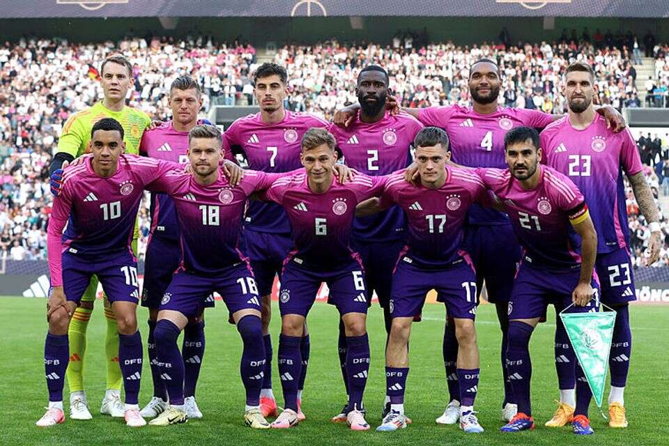 מדי החוץ של המארחת מפתיעים אף יותר. גרמניה מעולם לא שיחקה בשילוב פסיכודלי של ורוד וסגול. הוגי המדים מסבירים שהם משקפים את הדור החדש של האוהדים ומזכירים שבכל זאת יש בהם נגיעה לעבר: המשולשים המחודדים במפגש של ורוד וסגול מזכירים את מתאר כנפי הנשר, הסמל המסורתי של גרמניה. הואיל ולגרמניה אין בלעדיות על הנשר, בפאטרן המאיים משהו של העוף הדורס הזה מתהדרים גל שני הסטים של מדי נבחרת אלבניה.