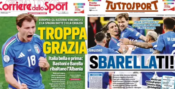 "הלב של איטליה", נכתב בכותרת ה'גאזטה', "סופר קאמבק בבכורה ביורו. ביום חמישי ספרד שכבשה שלישייה מול קרואטיה מחכה". ב'קוריירה דלו ספורט' הוסיפו: "יותר מדי. איטליה יפהפיה, באסטוני ובארלה הפכו מול אלבניה וספאלטי רוצה יותר נחישות". ב'טוטוספורט' סיכמו: "התחלה מפתיעה, אבל אז הגיע מהפך בחמש דקות. מוראטה הזהיר את האזורי בספרד".