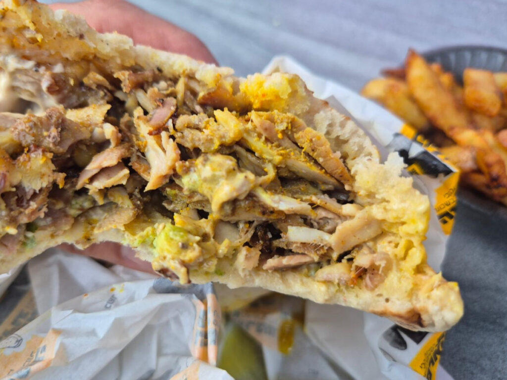 הפיתה הרכה והספוגה בטעמים הייתה בינונית בגודלה, אך עמוסה בבשר שהיה איכותי, רך, שומני ומתובל במידה. בכל רגע בדקנו שאכן אלו חתיכות הודו ועגל שמחכות עמוק בפנים ולא ירקות שידעו ימים טובים יותר. המנה הייתה עשירה בבשר, משביעה וטעימה. הצ'יפס שקיבלנו היה טעים, עבה ובשרני אבל לא היה חם במיוחד. יצאנו בתחושה שאם רוצים באמת, אפשר למכור שווארמה טובה איכותית וטעימה במחיר שלא קורע את הכיס.