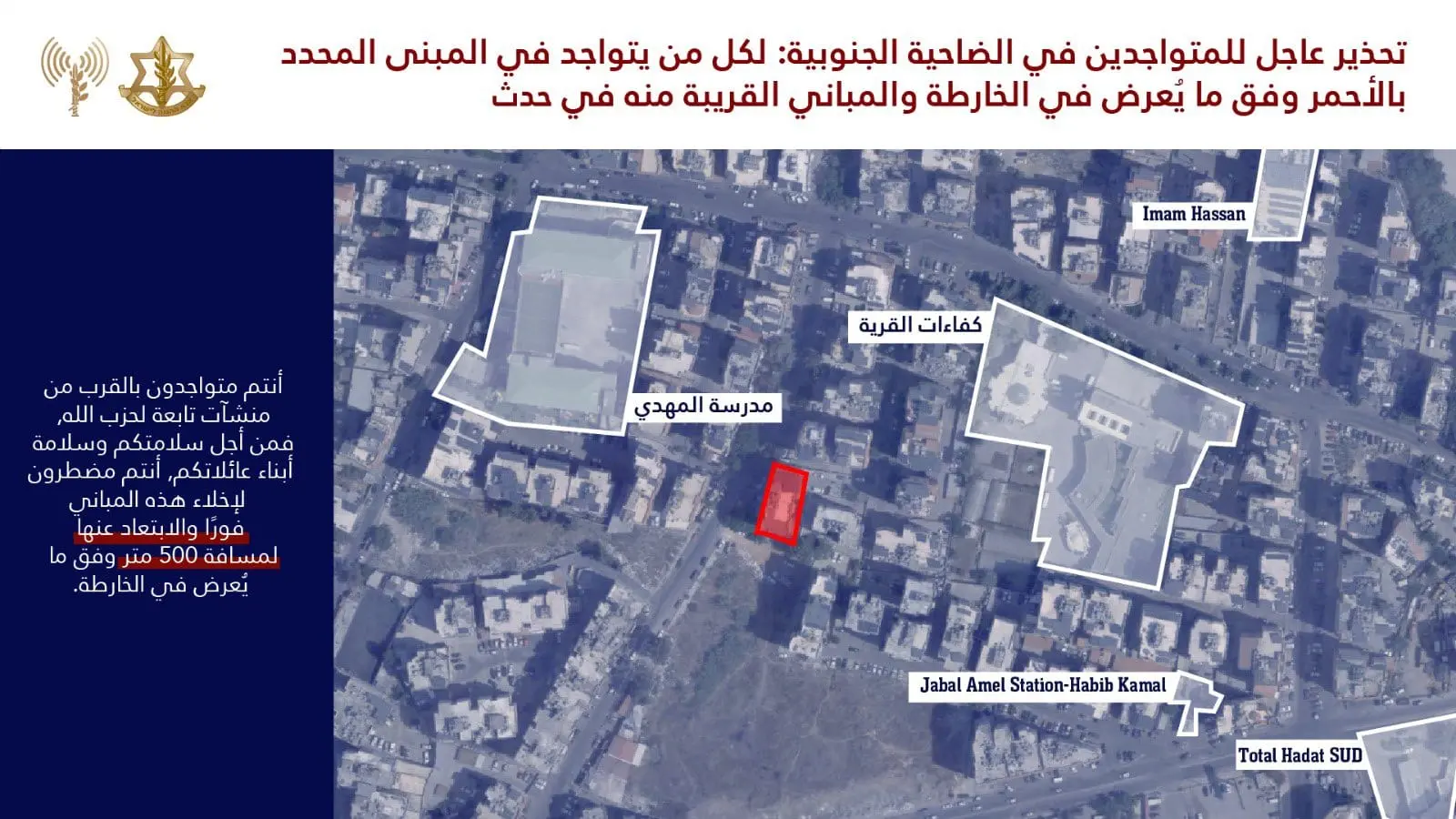 האזהרה הופנתה במיוחד לתושבי חארת חריכ והאזורים הסמוכים, כשהדובר הדגיש: "אתם שוהים בקרבת מתקני חיזבאללה שצה"ל מתכנן לתקוף בקרוב".