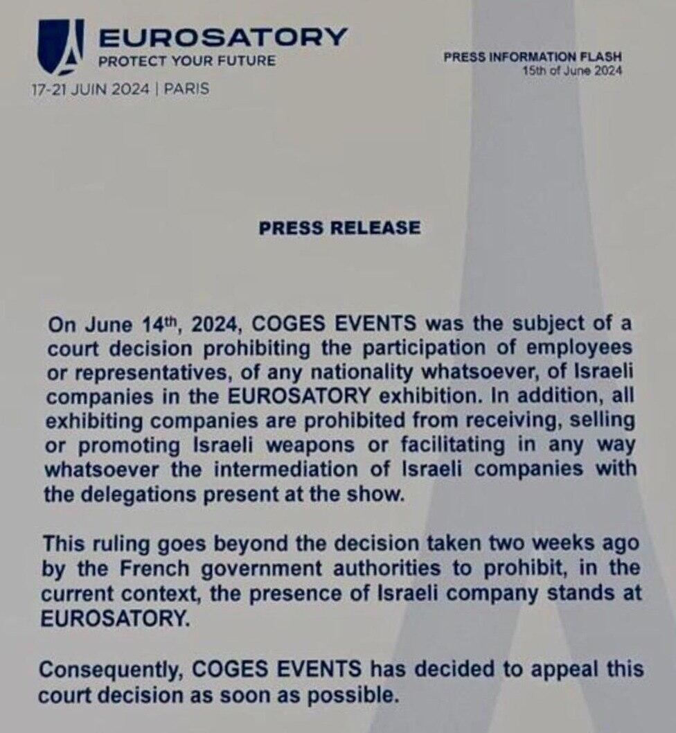 תערוכת הנשק יורוסטורי 2024 נפתחה בפריז, וכניסת הנציגים הישראלים נאסרה – כפי שהורה בית המשפט המחוזי בצרפת. הדוכן הישראלי, שמהווה בדרך כלל את אחד משיאי התערוכה השנתית, עומד שומם למרות מיקומו המרכזי. בצעד חפוז שנועד להסתיר את החלל הריק – שנצבע כחול – נתלו על הקירות צילומים של צבא צרפת. ביתר השטח העצום הוקמו בתי קפה.