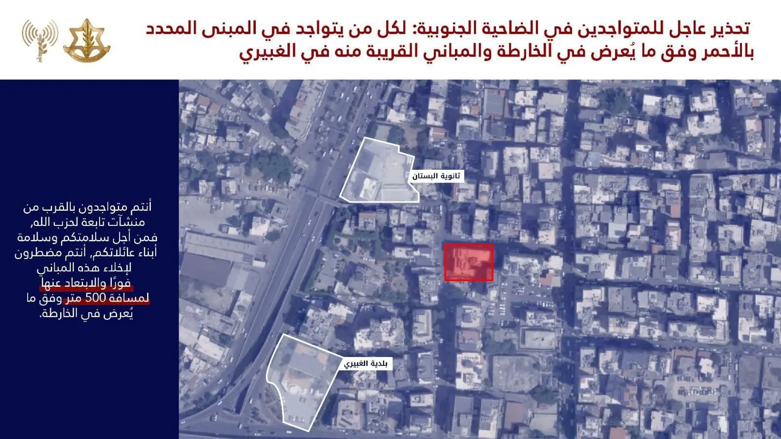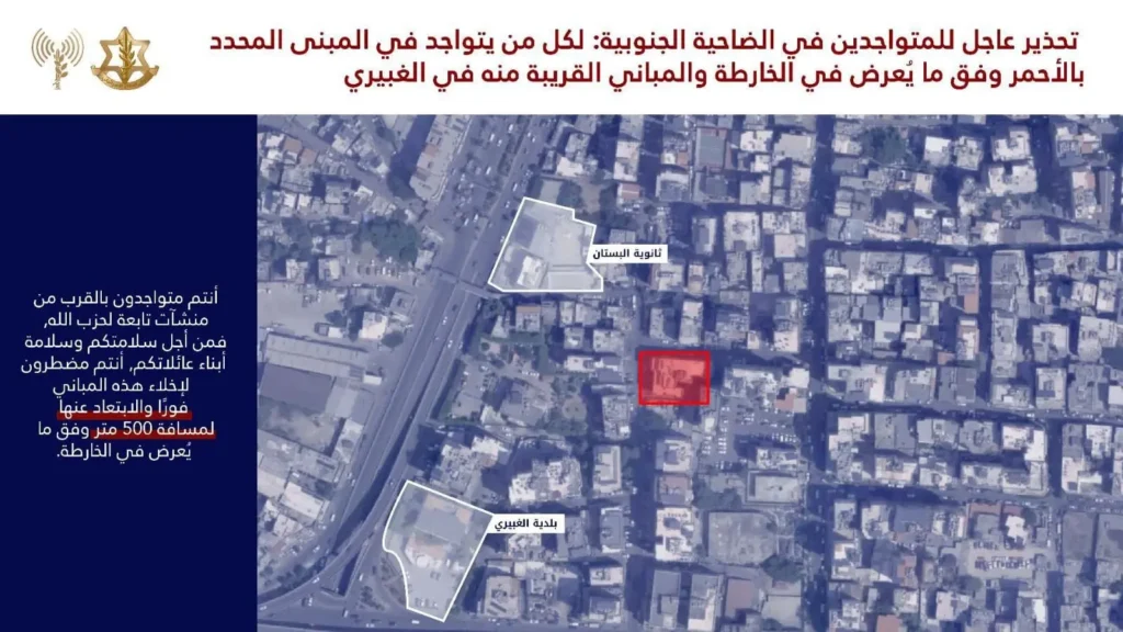בעקבות התקיפות הליליות ברובע דאחייה שבביירות, פרסם הבוקר דובר צה"ל בערבית, אל"מ אביחי אדרעי, אזהרה דחופה לתושבי האזור. ההודעה מתמקדת בשני אזורים מרכזיים:
