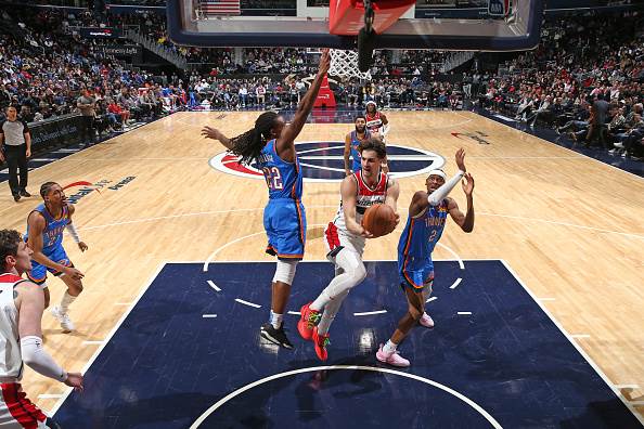 WASHINGTON, DC -? JANUARY 8: Deni Avdija #8 of the Washington Wizards passes the ball during the game against the Oklahoma City Thunder on January 8, 2024 at Capital One Arena in Washington, DC. NOTE TO USER: User expressly acknowledges and agrees that, by downloading and or using this Photograph, user is consenting to the terms and conditions of the Getty Images License Agreement. Mandatory Copyright Notice: Copyright 2024 NBAE (Photo by Kenny Giarla/NBAE via Getty Images)