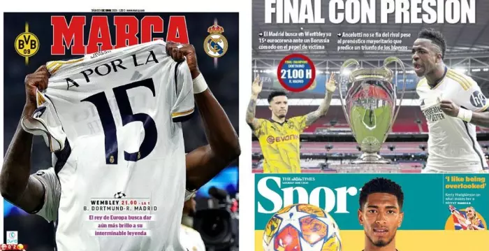 המשחק שיכריע את הזוכה בליגת האלופות ייערך ב-22:00 בין ריאל לדורטמונד וב'טיימס' סימנו את האנגלי, בעוד שב'מארקה' כבר "הכתירו" את הבלאנקוס