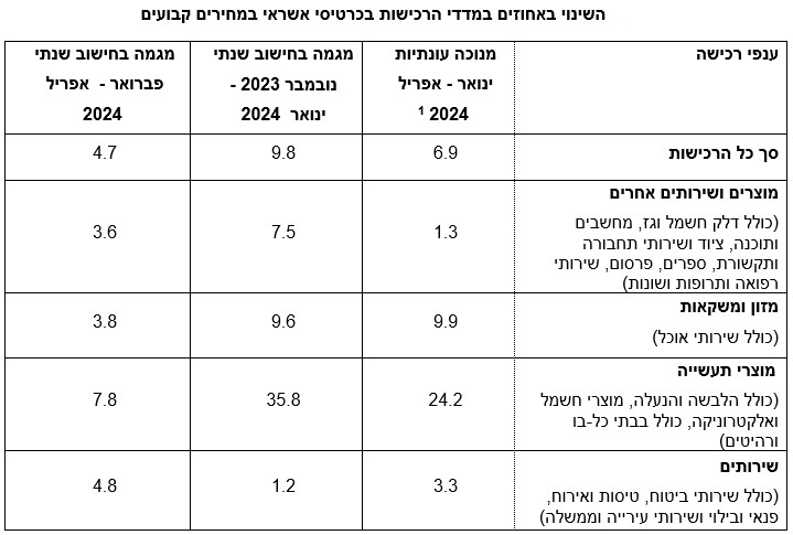 בקבוצת המזון והמשקאות (כולל שירותי אוכל), המהווה 16% מסך הרכישות בשנת 2022, חלה עלייה של 3.8% בחישוב שנתי בפברואר – אפריל 2024.