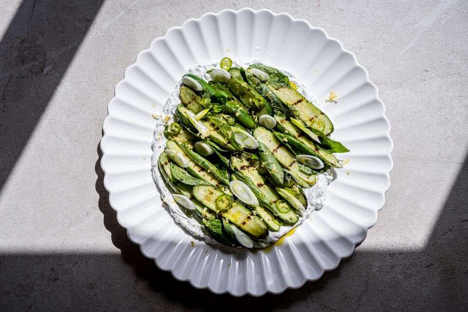 - מורחים את הלאבנה על צלחת שטוחה, מניחים מעל את המלפפונים הצרובים וביניהם מסדרים את עלי הבזיליקום, הבצל הירוק והפלפל החריף.