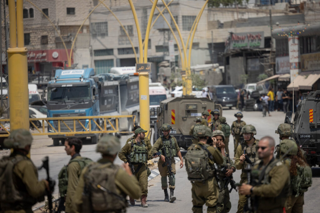 Israeli security forces seen at the entrance to the West Bank city of Hebron, after the deadly shooting attack on Route 60, August 21, 2023. Photo by Chaim Goldberg/Flash90 *** Local Caption *** פיגוע שוטרים הרוגים צומת הכבשים כביש 60 ירי חברון