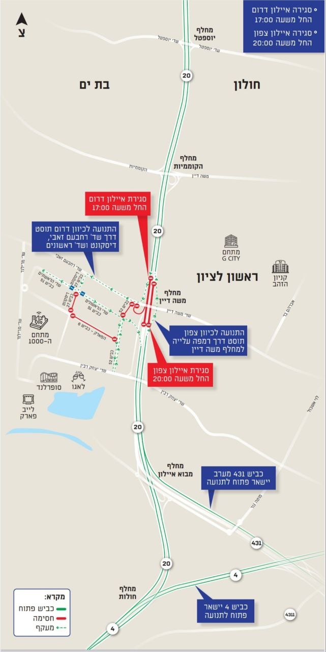 לפי אגף התנועה, ככל שיהיה עומס תנועה כבד במקום, יחסמו לתנועה לפרקי זמן משתנים גם הירידות לכביש 20 דרום מהצמתים הולץ, וולפסון וחולון.
