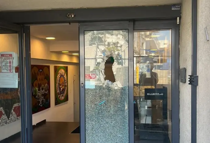 דלת הכניסה למערכת "הארץ" בתל אביב נופצה. המאייר עמוס בידרמן, שיתף את התמונה וכתב: "ביחד ננצח"